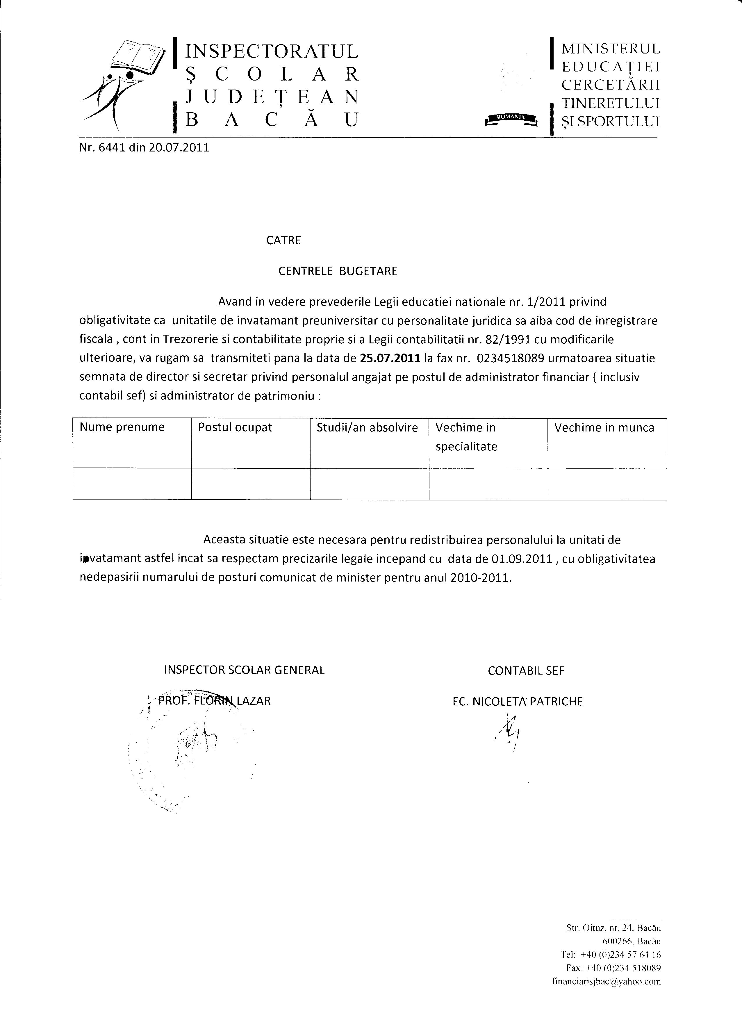 IMPORTANT! IN ATENTIA CENTRELOR BUGETARE - ADRESA ISJ BACAU NR. 6441/2011