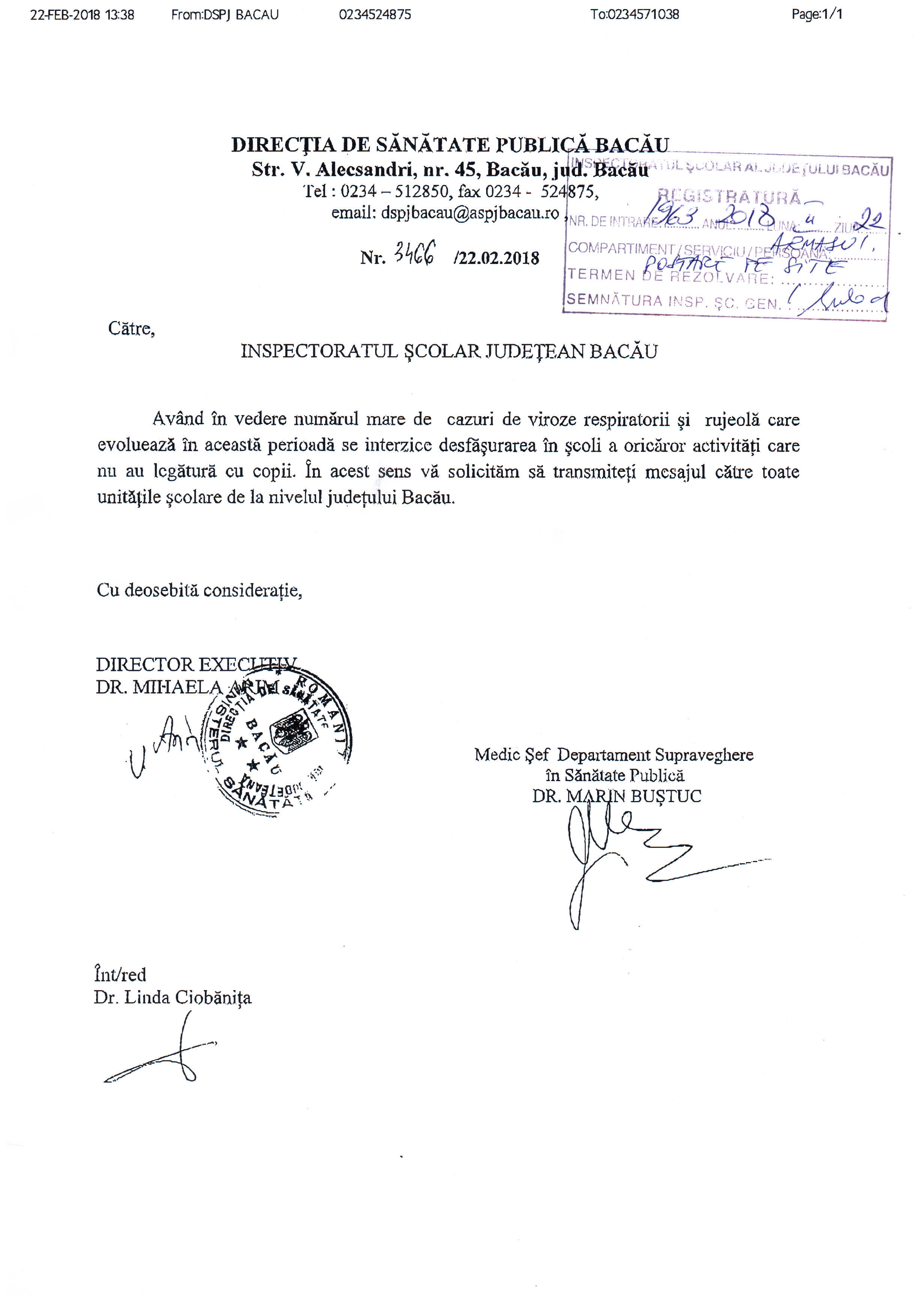Important ! In atentia unitatilor de invatamant-Adresa DSP Bacău