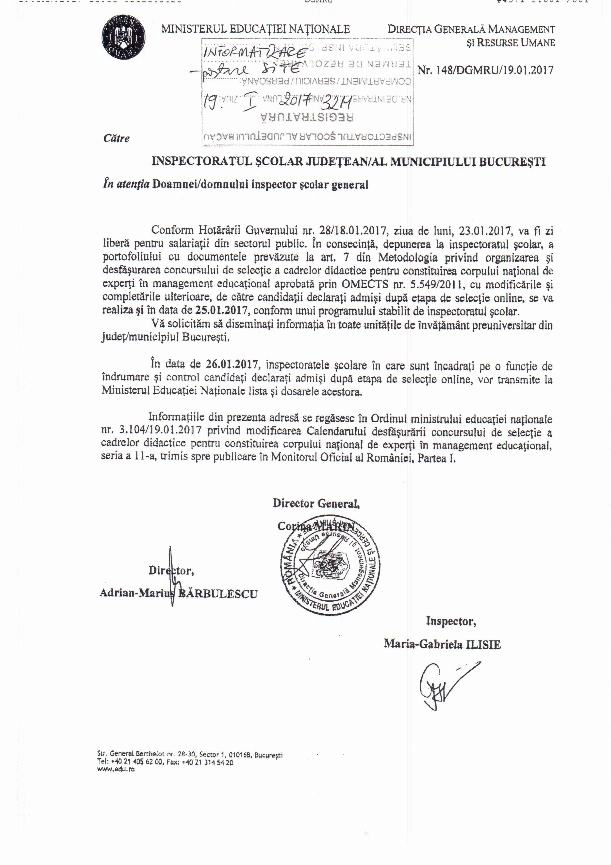 Concursul de selecție a cadrelor didactice pentru constituirea Corpului național de experți în management educațional, organizat în perioada SESIUNEA 2017, seria a 11-a