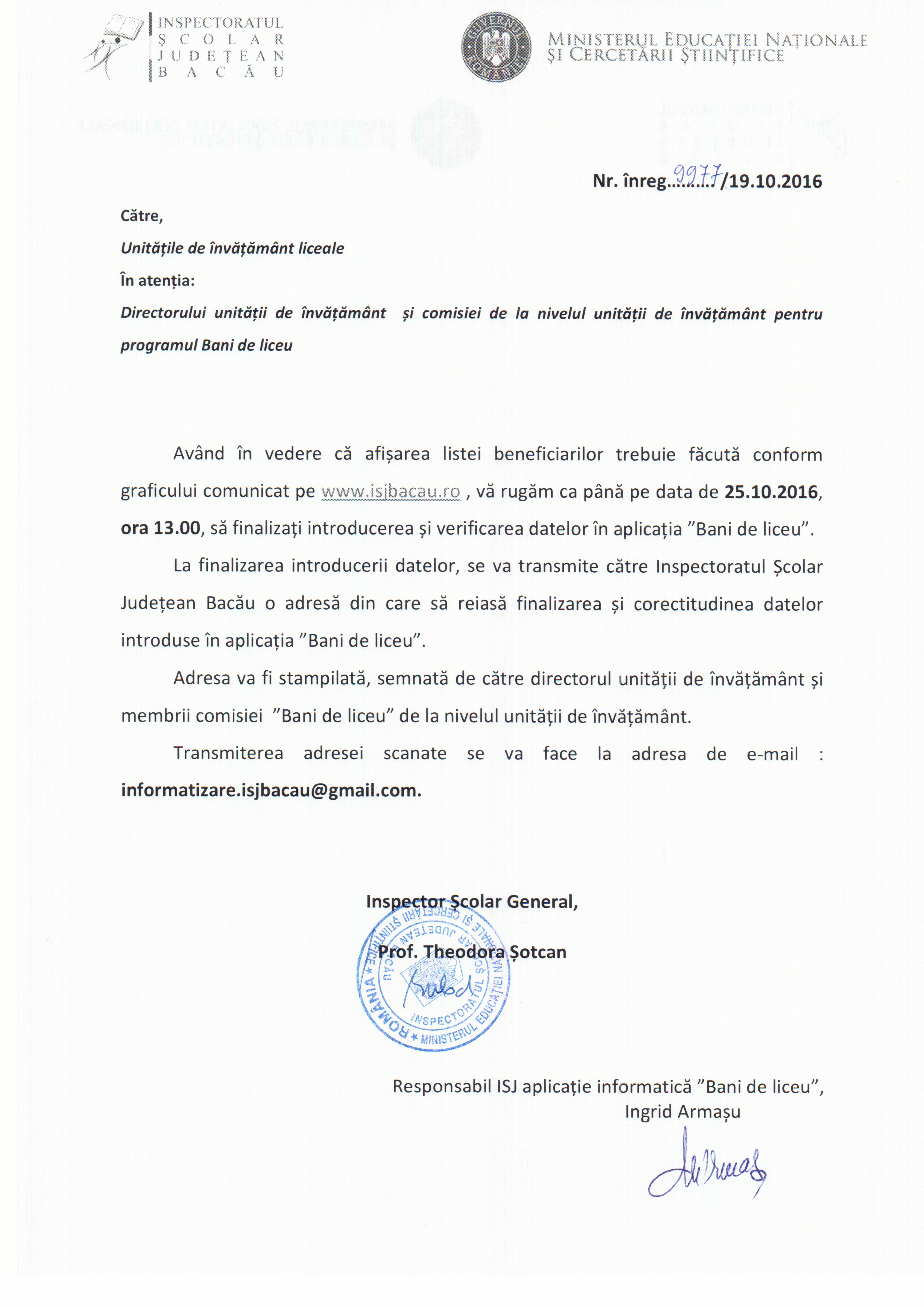 In atentia unitatilor de invatamant liceale-finalizare introducere date aplicație informatica ” Bani de liceu ”, an scolar 2016-2017
