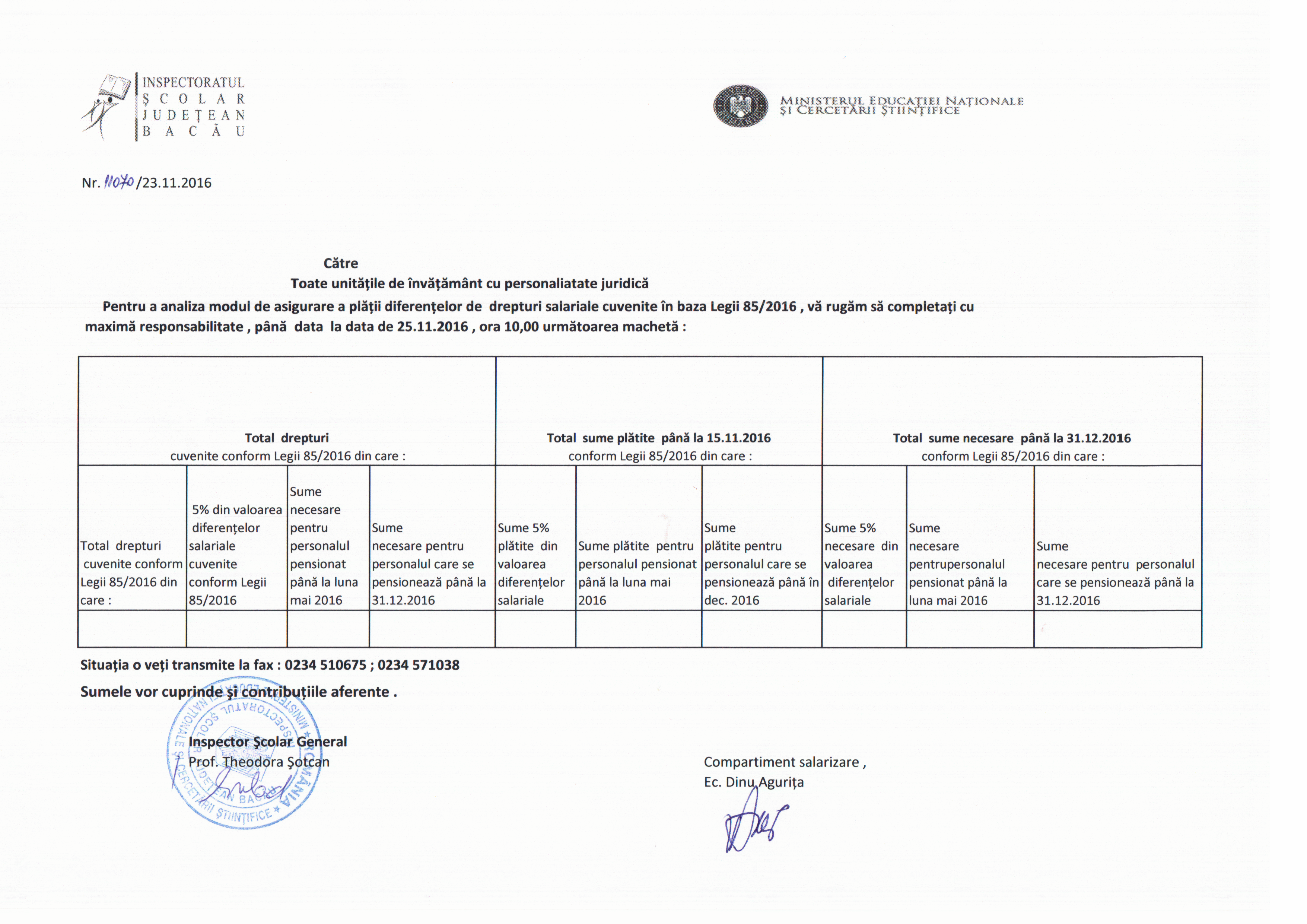In atentia unitatilor de invatamant-Modul de asigurare a platii diferentelor salariale cuvenite in baza legii 85/2016