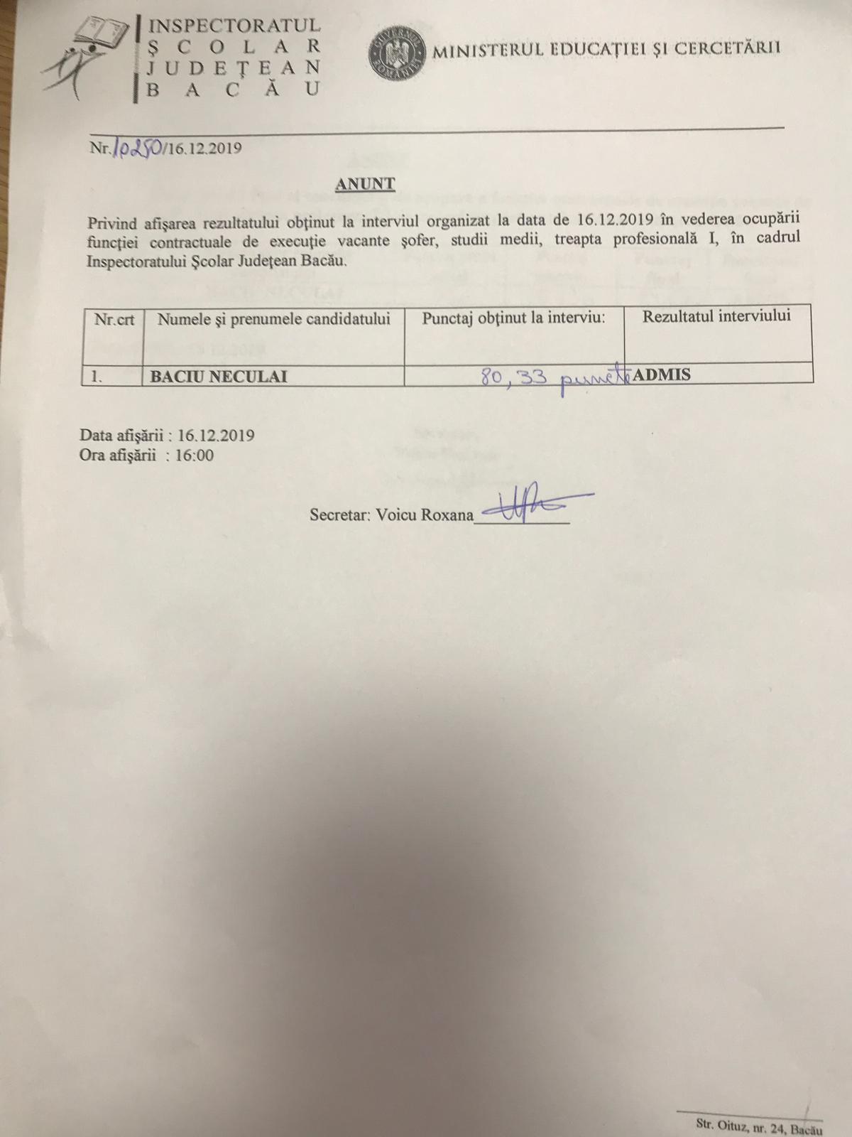 Rezultate interviu concurs 0.5 post șofer ISJ Bacău