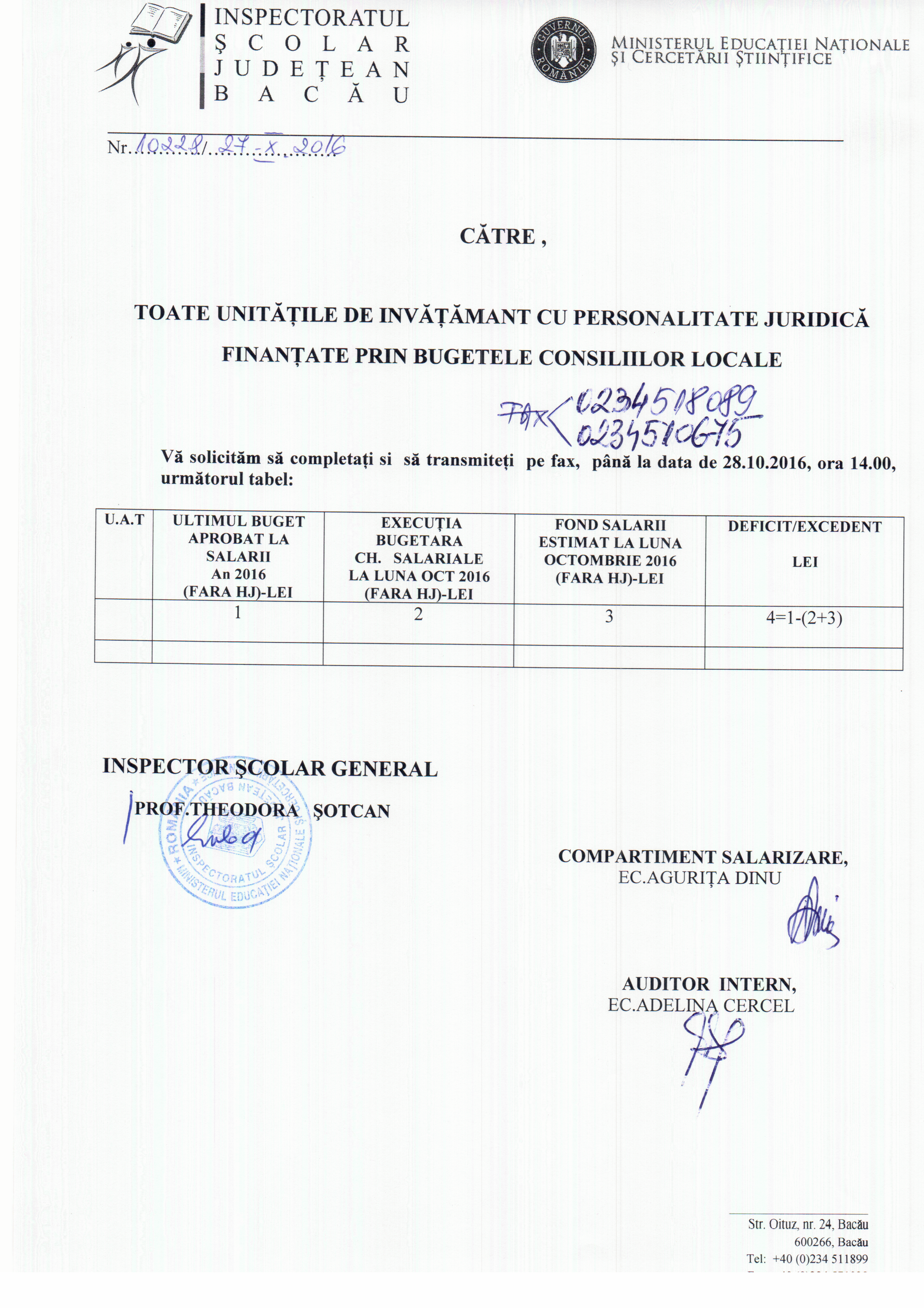 URGENT! In atentia unităților școlare-Situație deficit/excedent la fondul de salarii