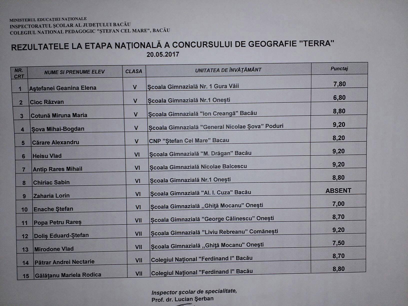 Rezultate Concurs Terra, etapa nationala (20 mai 2017)