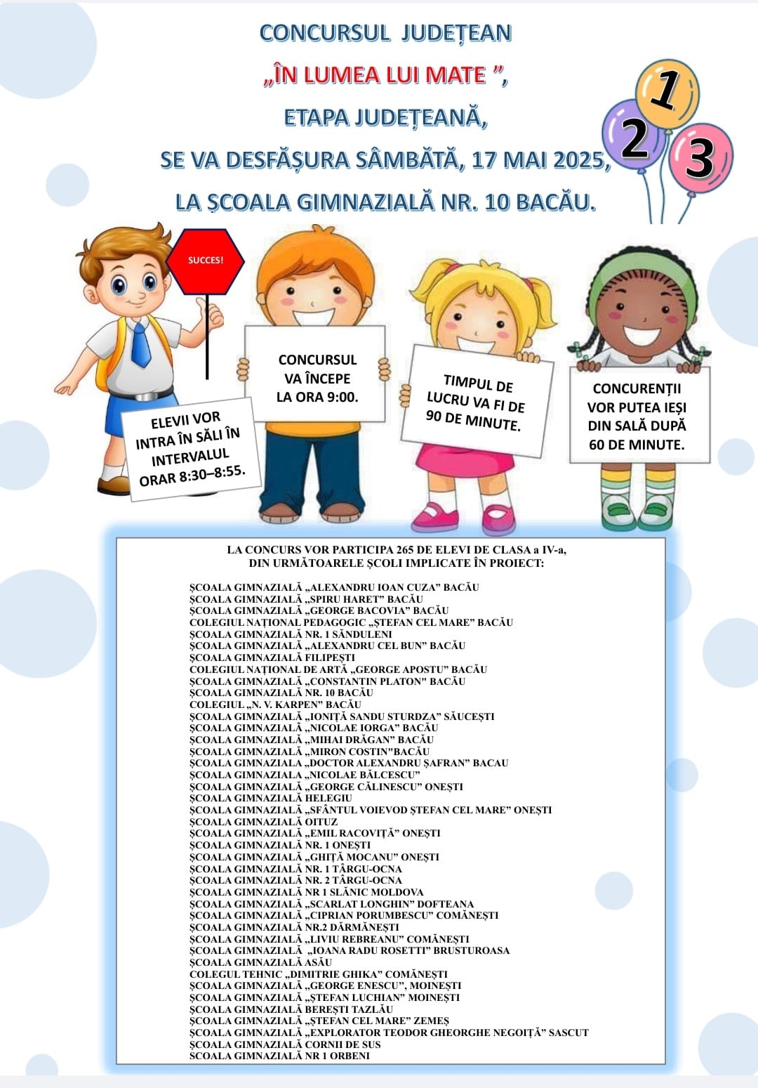 Concursul județean „În lumea lui Mate"- ediția a III-a, inclus în Calendarul concursurilor școlare județene pe discipline-2025, la poziția 12, se va desfășura sâmbătă, 17 mai 2025, la Școala Gimnazială Nr. 10 Bacău. La concurs vor participa 265 de elevi