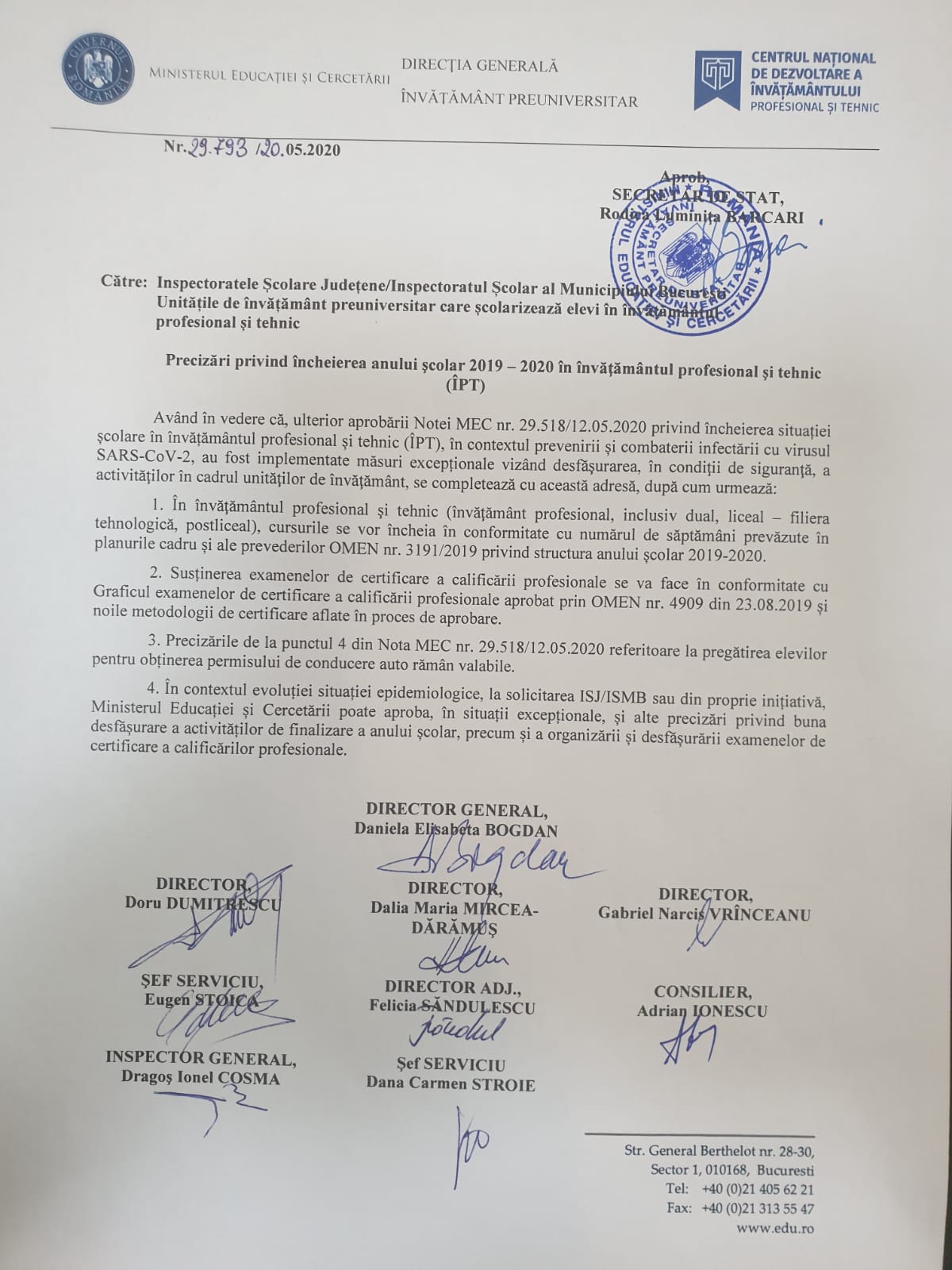 Noi precizari privind incheierea situatiei scolare in invatamantul profesional si tehnic, 2019 - 2020