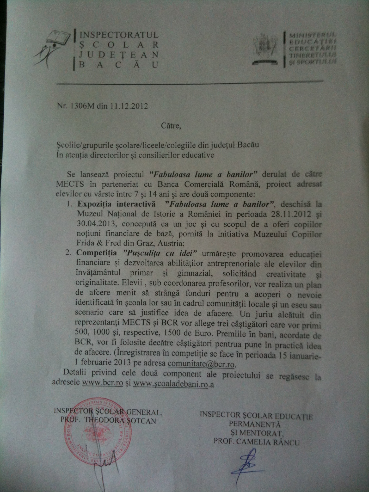 Proiect "Fabuloasa lume a banilor" si Concurs "Pusculita de idei"