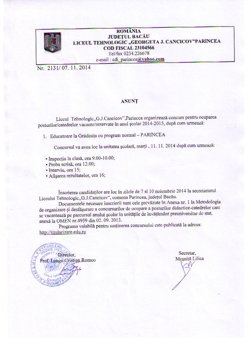 Anunț pentru organizarea concursului pentru ocuparea posturilor didactice/catedrelor vacante/rezervate la Liceul Tehnologic "G.J. Cancicov" Parincea