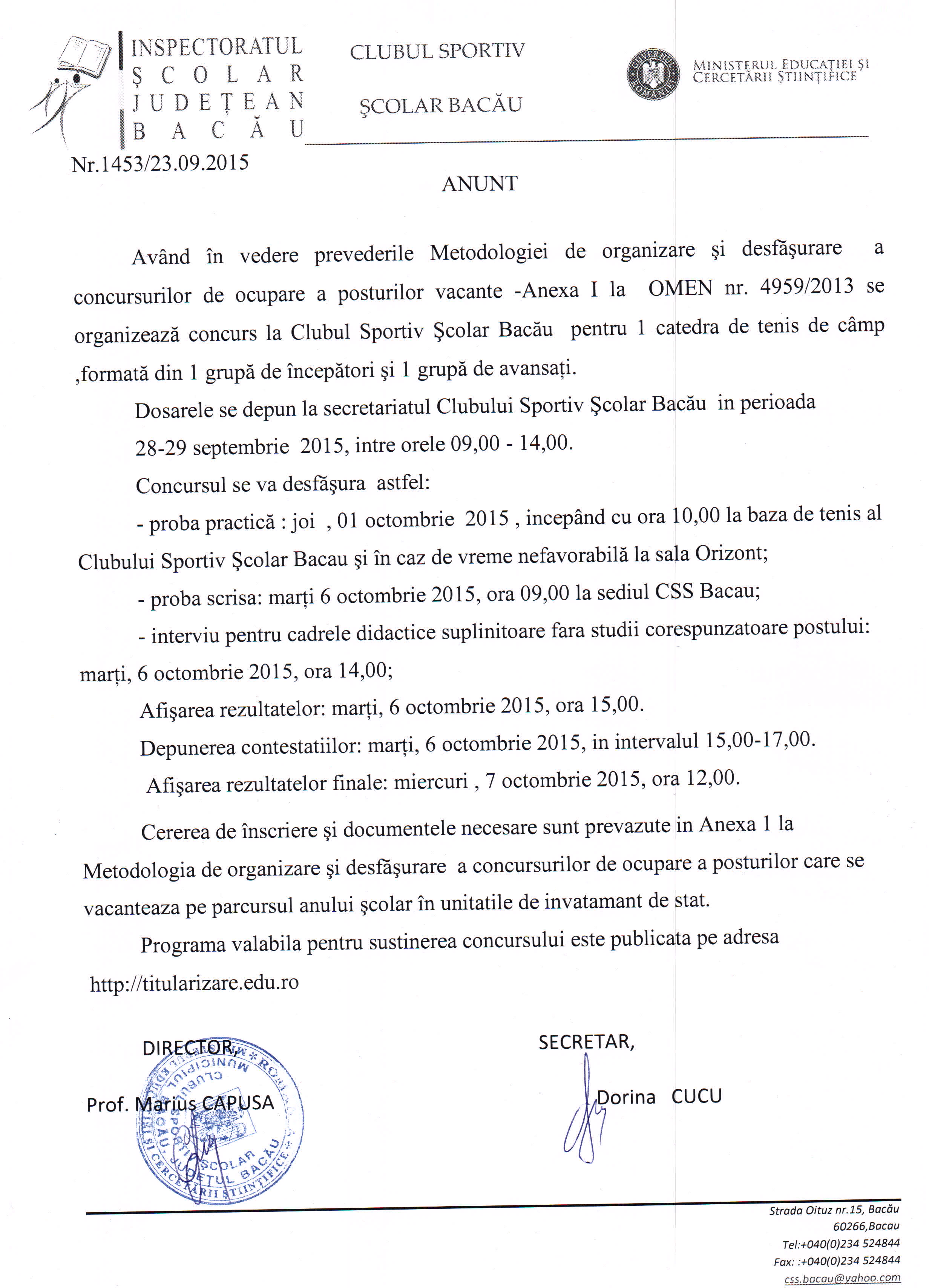 CLUB SPORTIV SCOLAR BACAU-ANUNT CONCURS