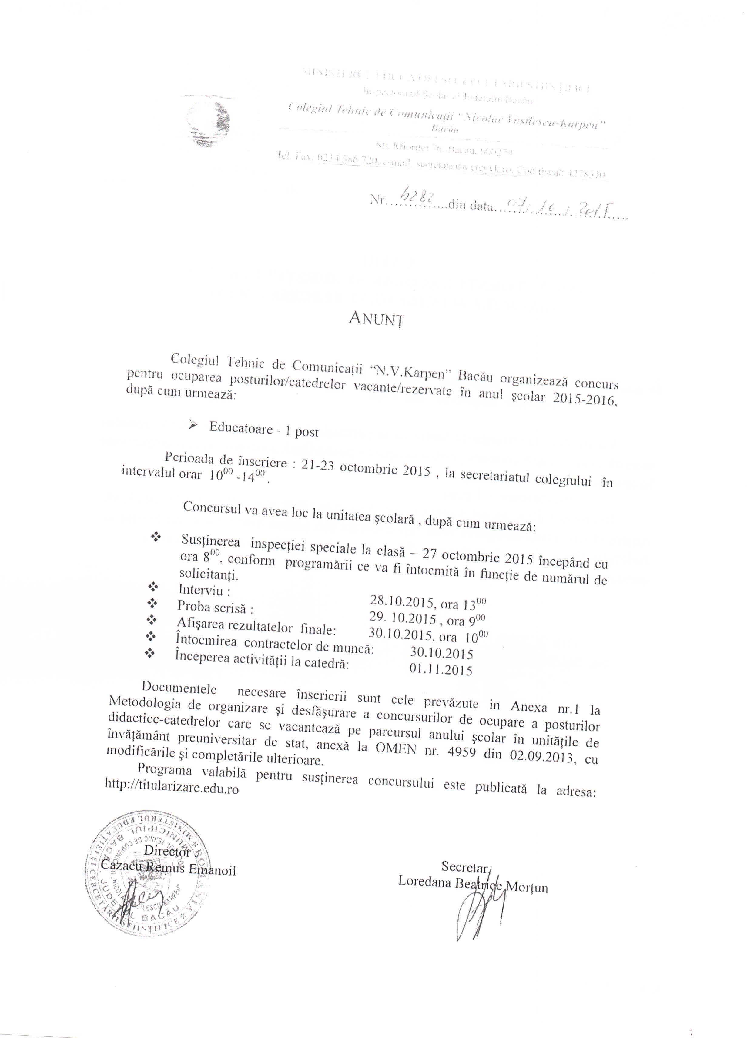 COLEGIUL TEHNIC "N.V. KARPEN" BACAU - ANUNT CONCURS