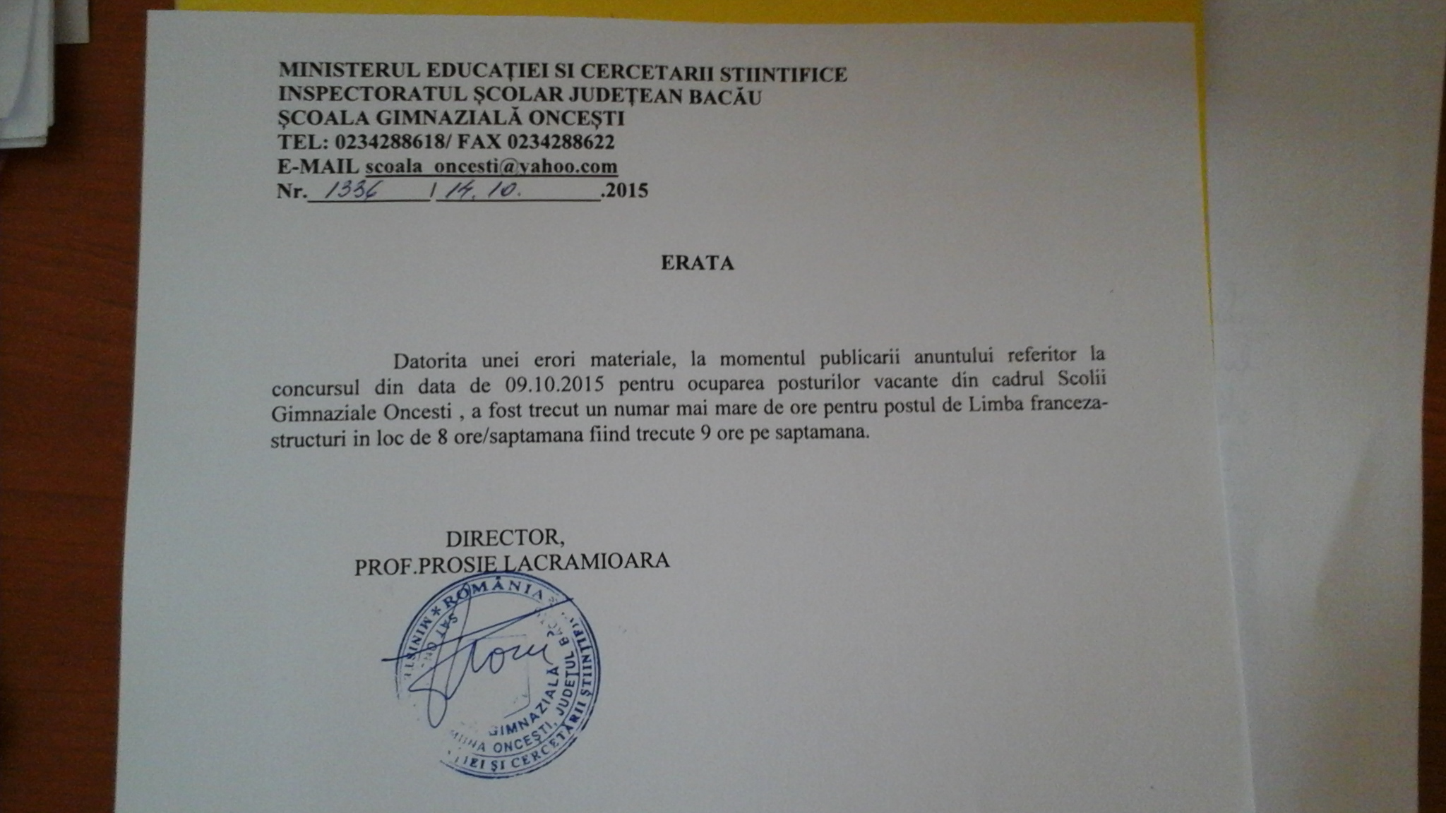 ERATA ANUNT CONCURS - SCOALA GIMNAZIALA ONCESTI