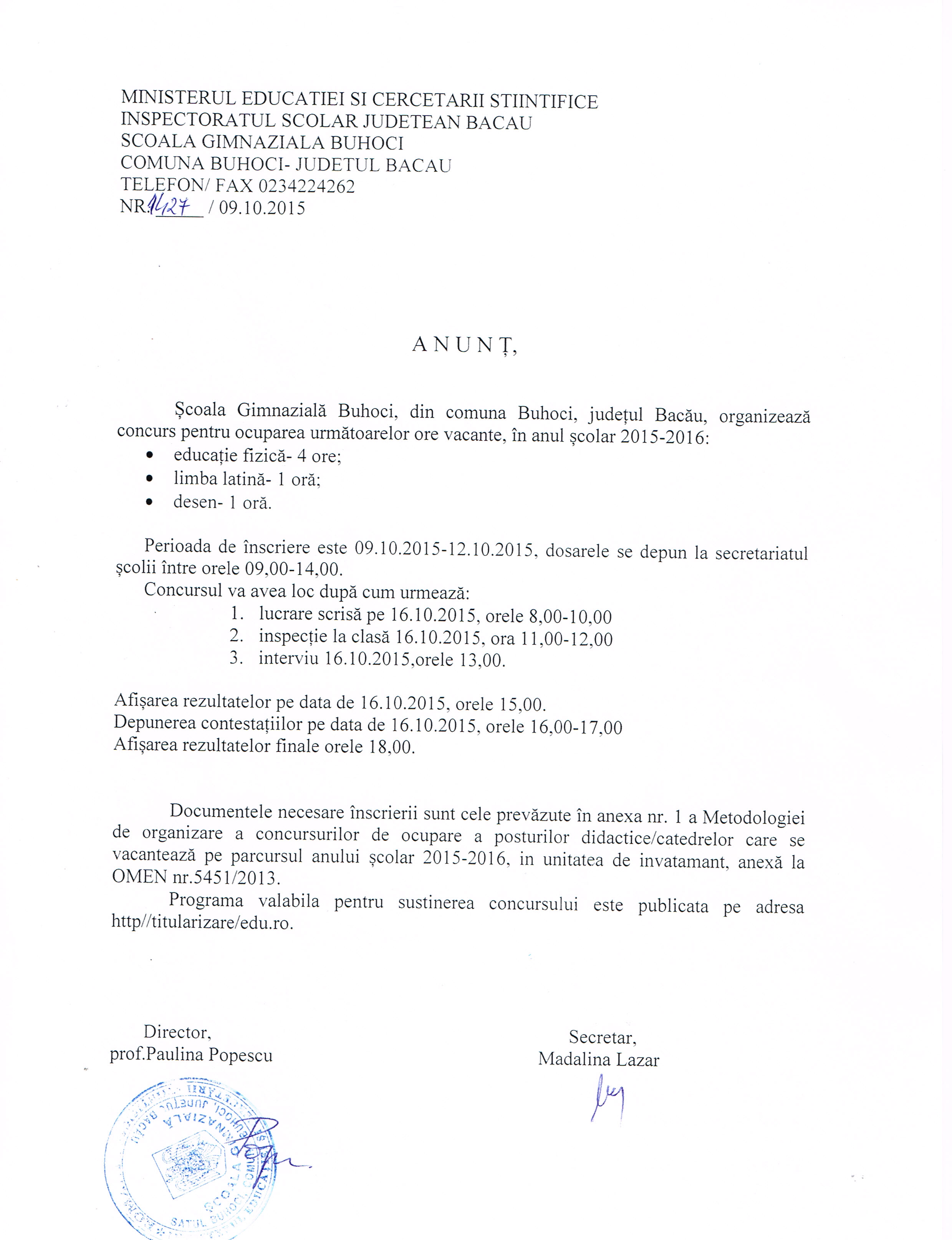 SCOALA GIMNAZIALA BUHOCI-ANUNT CONCURS