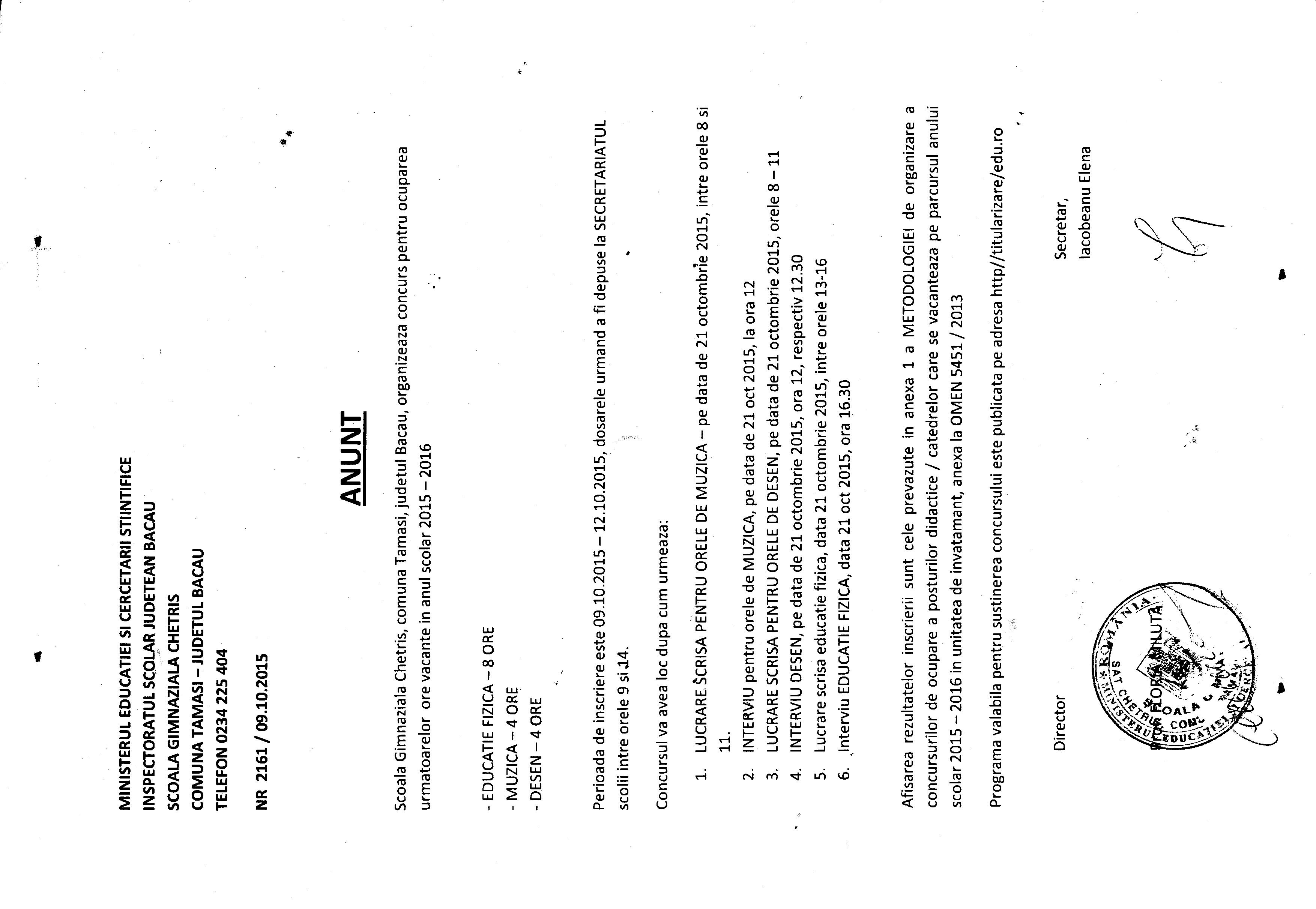 SCOALA GIMNAZIALA CHETRIS, COM. TAMASI - ANUNT CONCURS