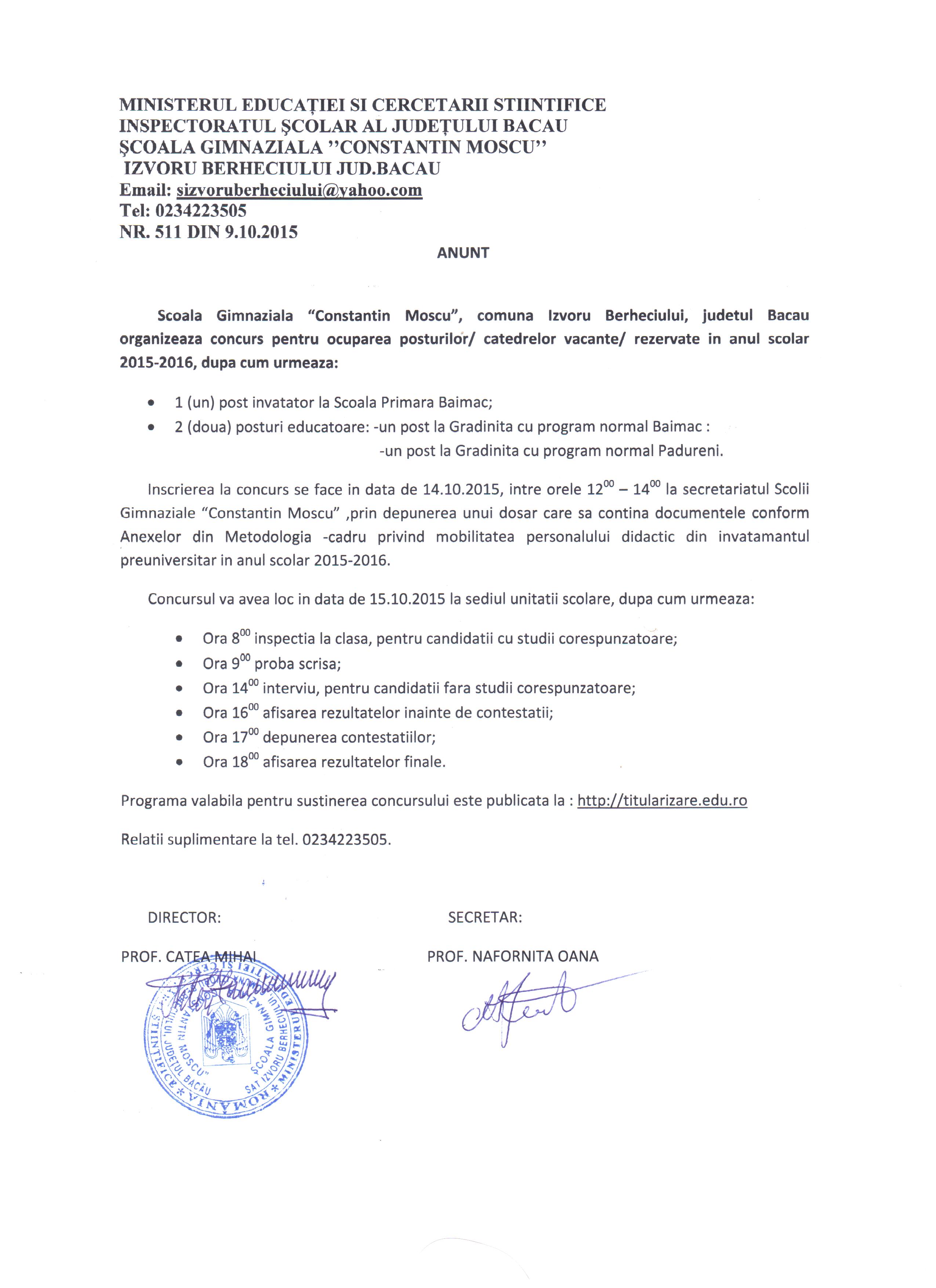 SCOALA GIMNAZIALA "CONSTANTIN MOSCU" IZVORU BERHECIULUI- ANUNT CONCURS