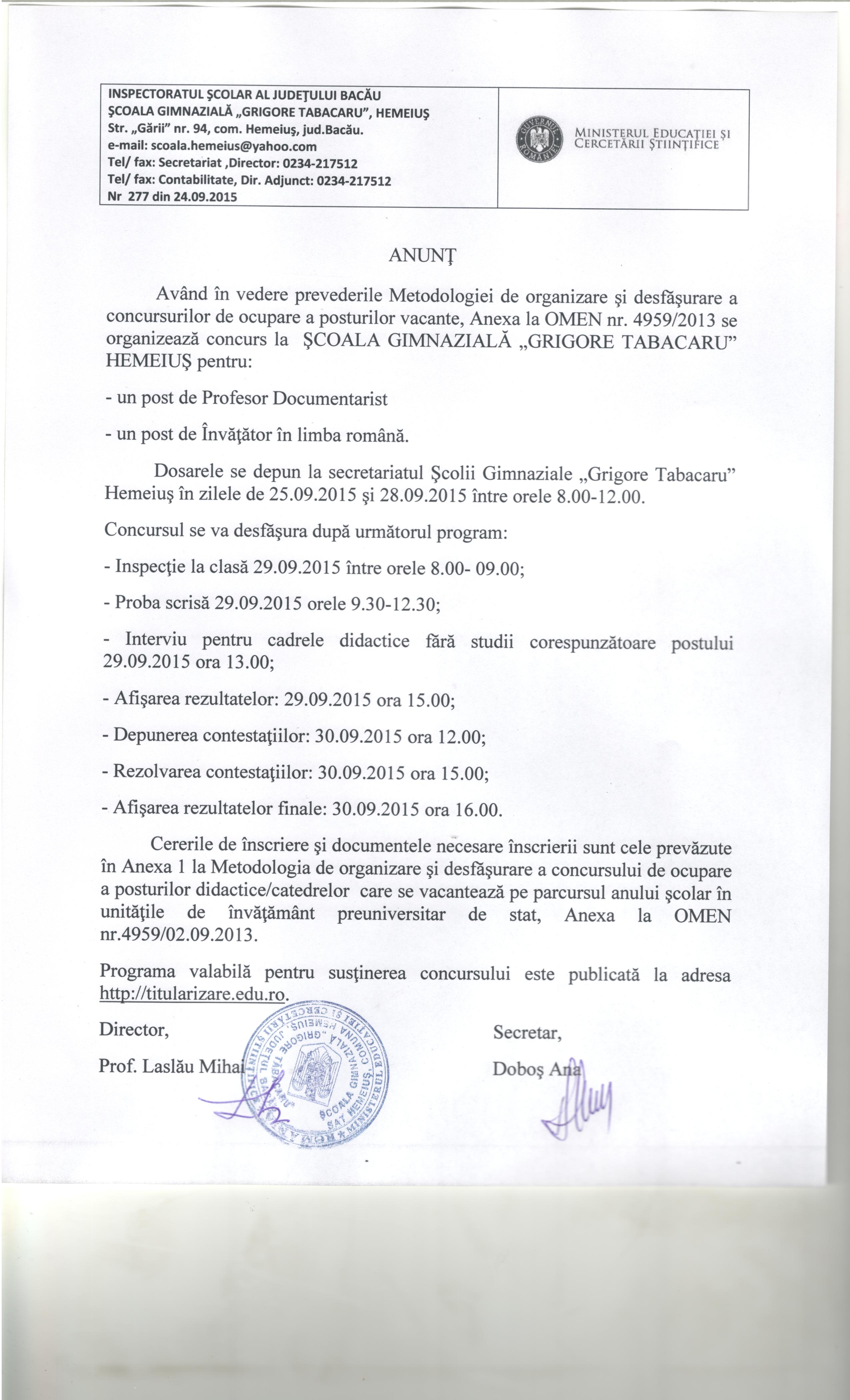 SCOALA GIMNAZIALA "GRIGORE TABACARU" HEMEIUSI- ANUNT CONCURS