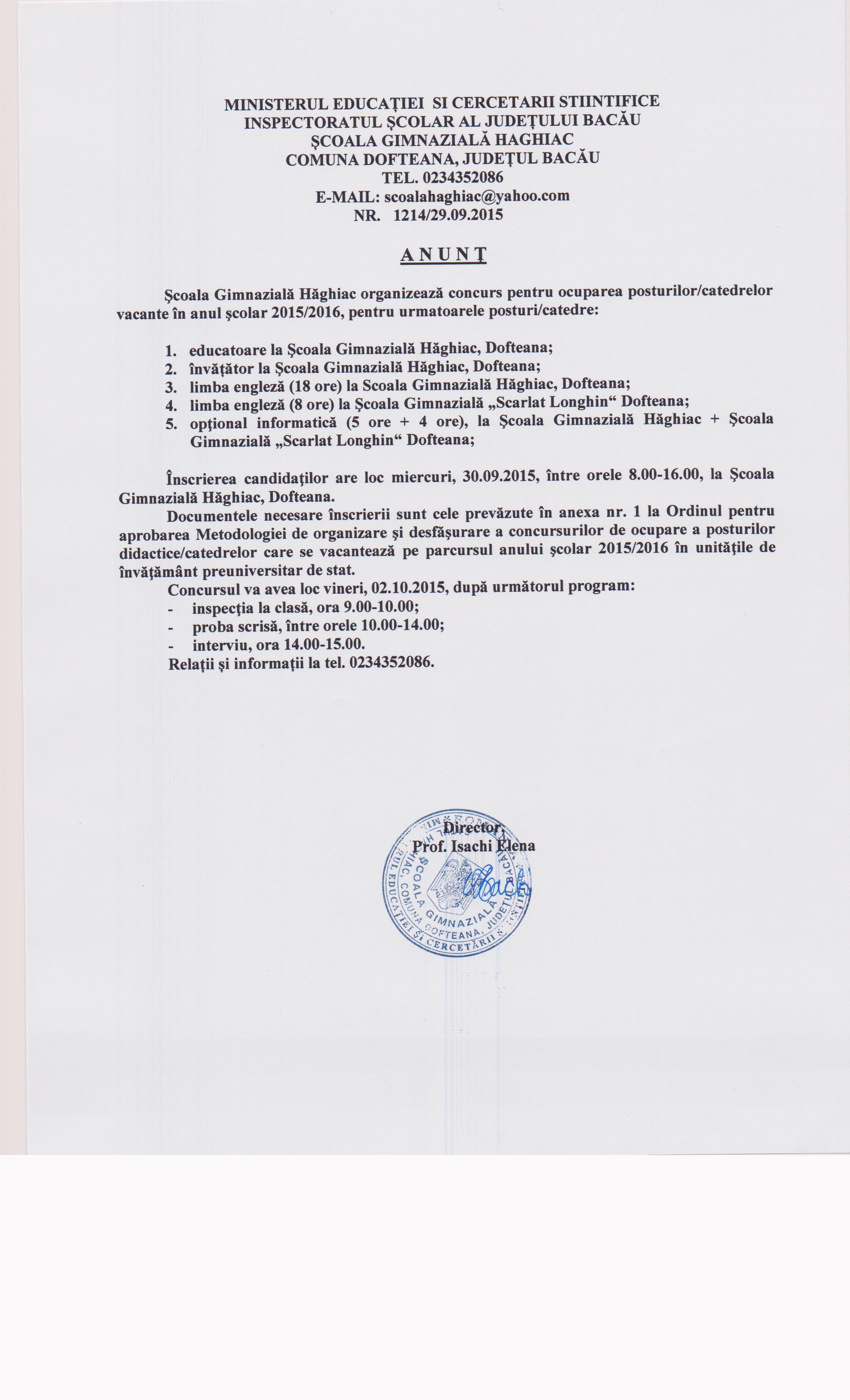 SCOALA GIMNAZIALA HAGHIAC COM DOFTEANA - ANUNT CONCURS