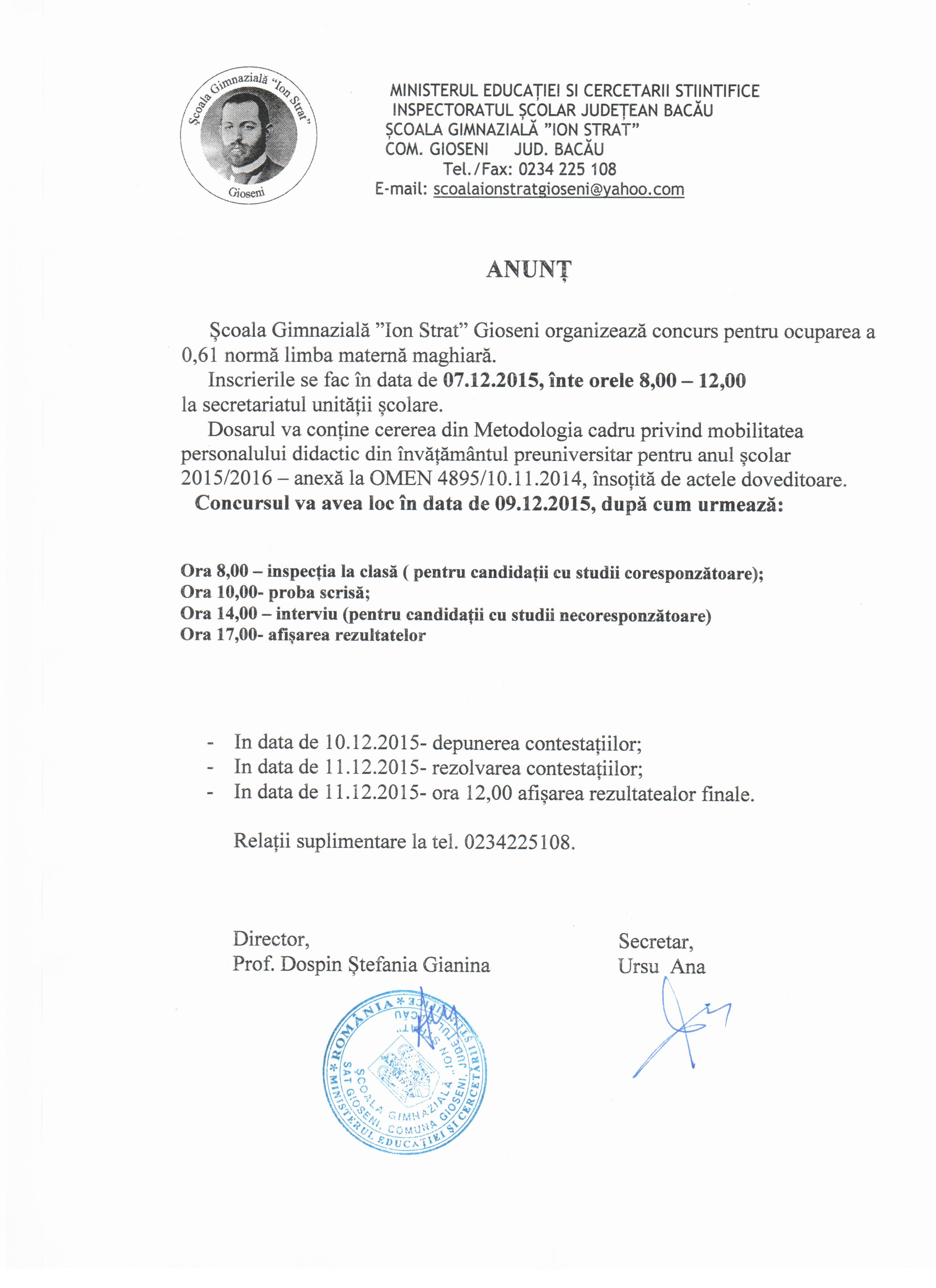 SCOALA GIMNAZIALA "ION STRAT" GIOSENI - ANUNT CONCURS