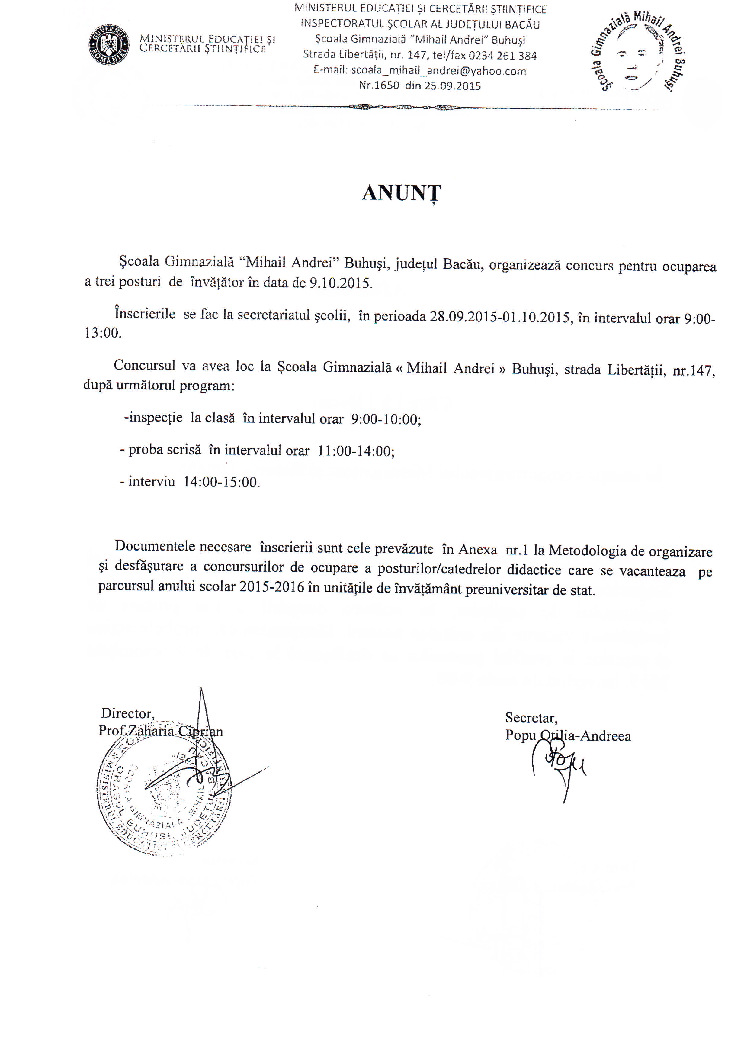 SCOALA GIMNAZIALA "MIHAIL ANDREI" BUHUSI - ANUNT CONCURS