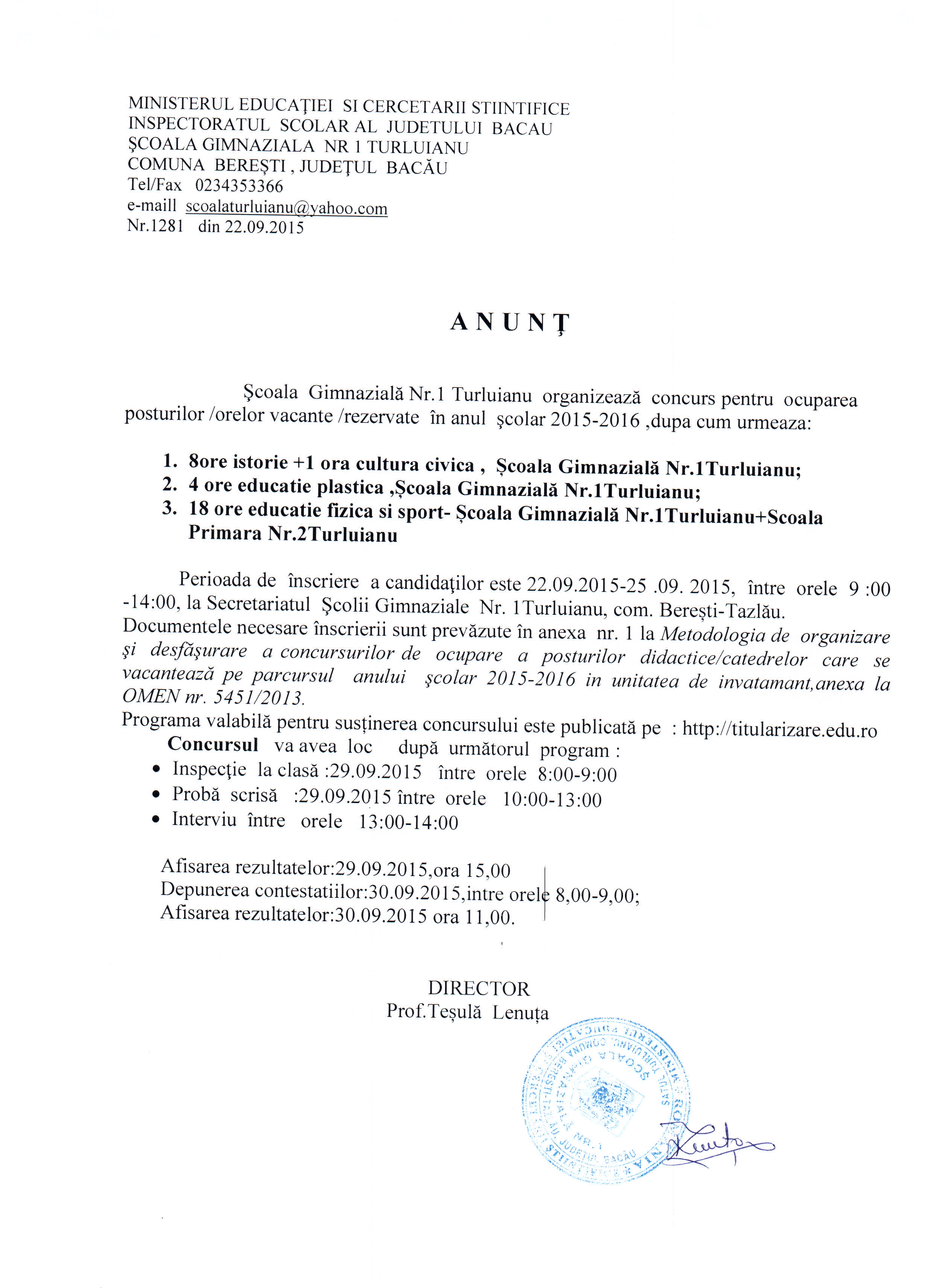 SCOALA GIMNAZIALA NR. 1 TURLUIANU/BERESTI TAZLAU- ANUNT CONCURS