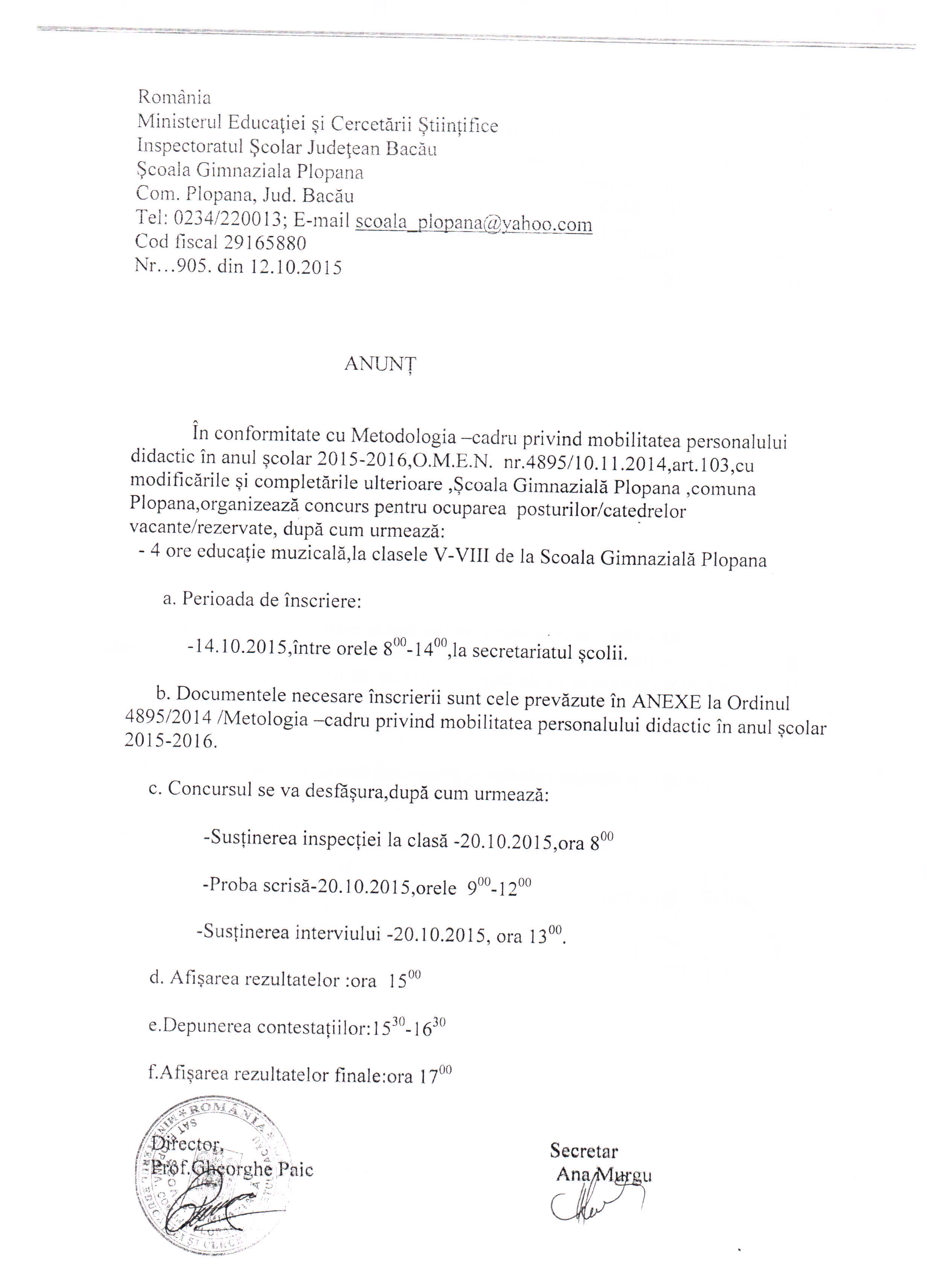 SCOALA GIMNAZIALA PLOPANA-ANUNT CONCURS