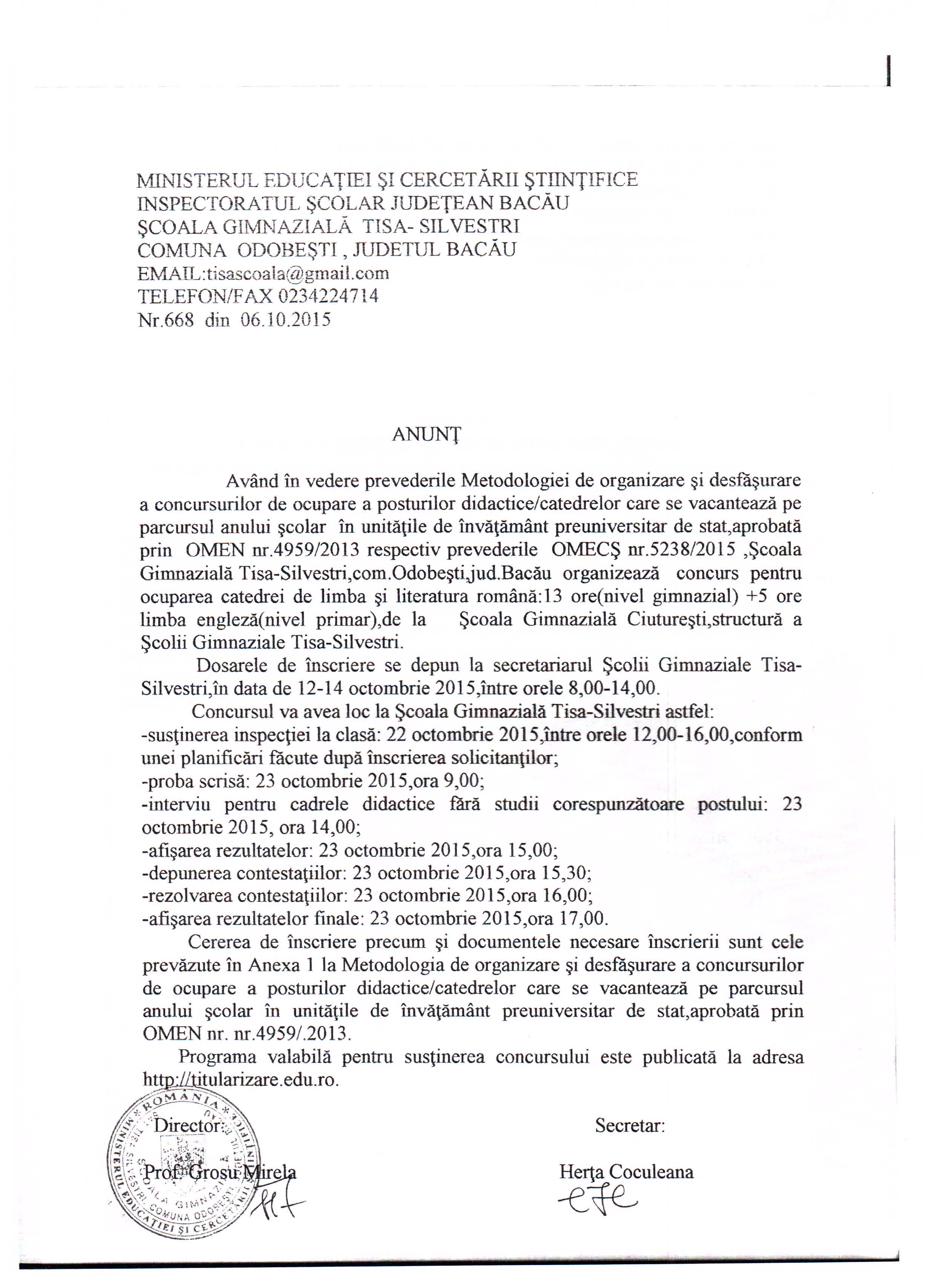 SCOALA GIMNAZIALA TISA SILVESTRI - ANUNT CONCURS