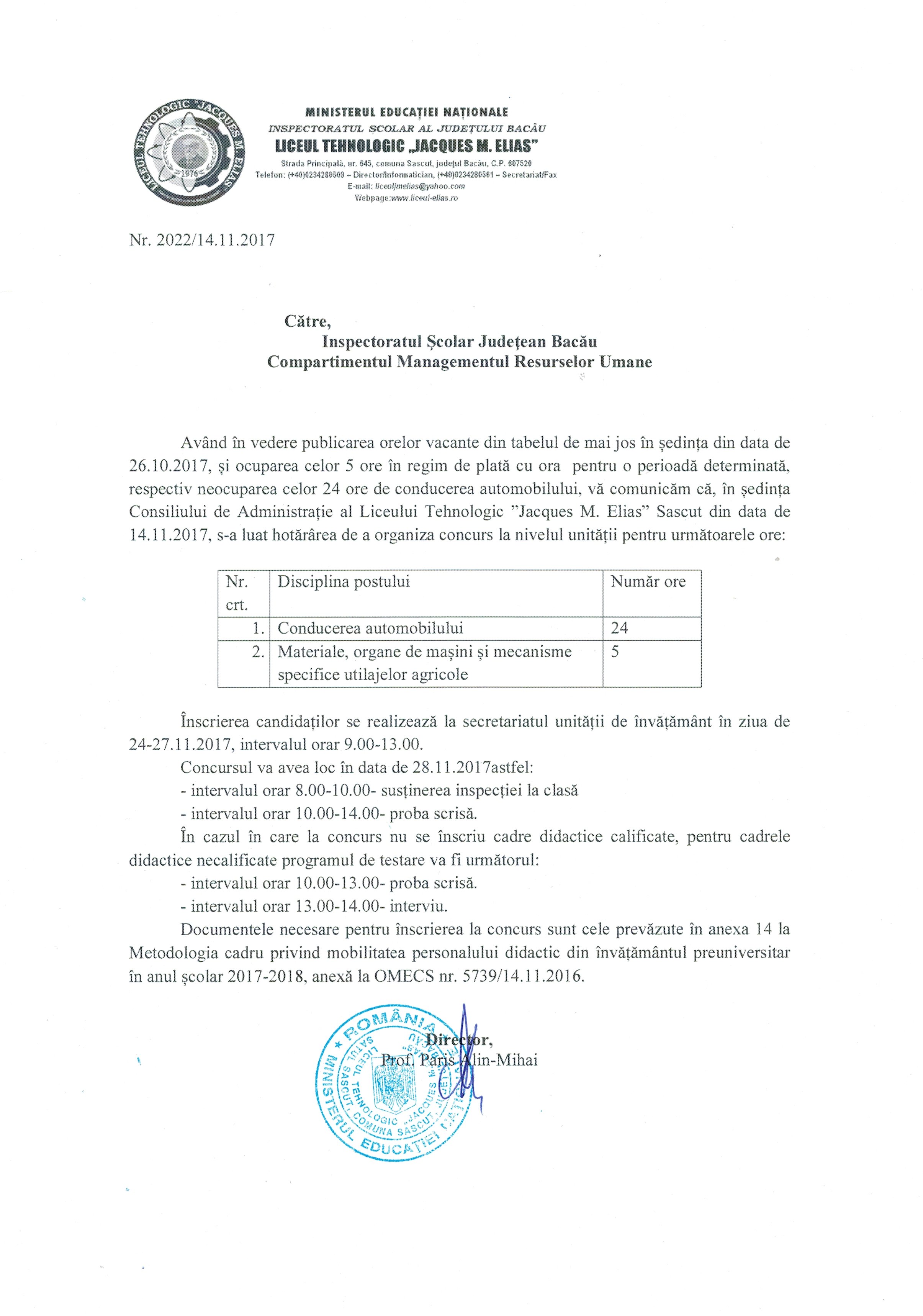 Anunt concurs - Liceul Tehnologic "J. M. Elias" Sascut