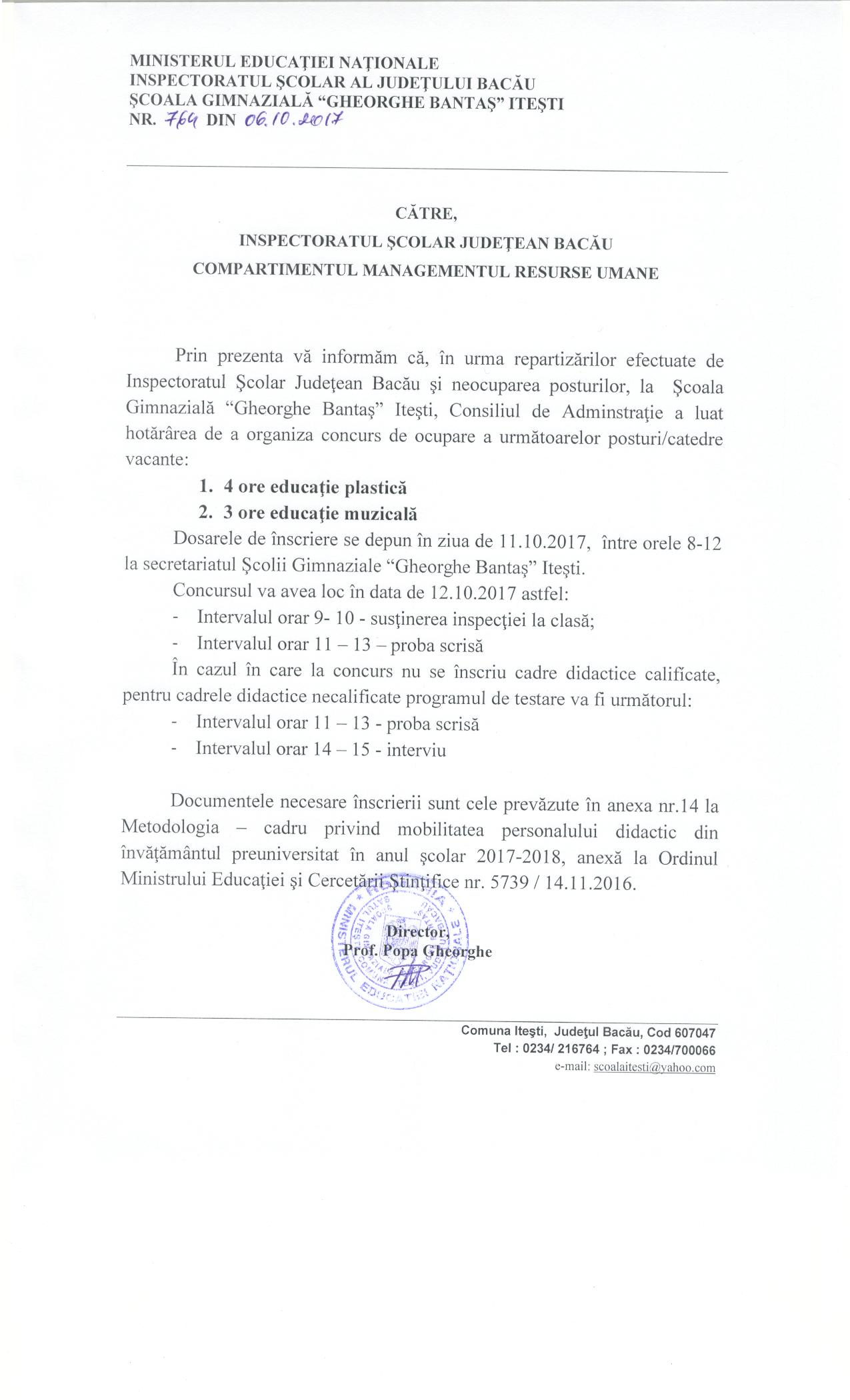 Anunt concurs - Scoala Gimnaziala ”Gheorghe Bantas” Itesti