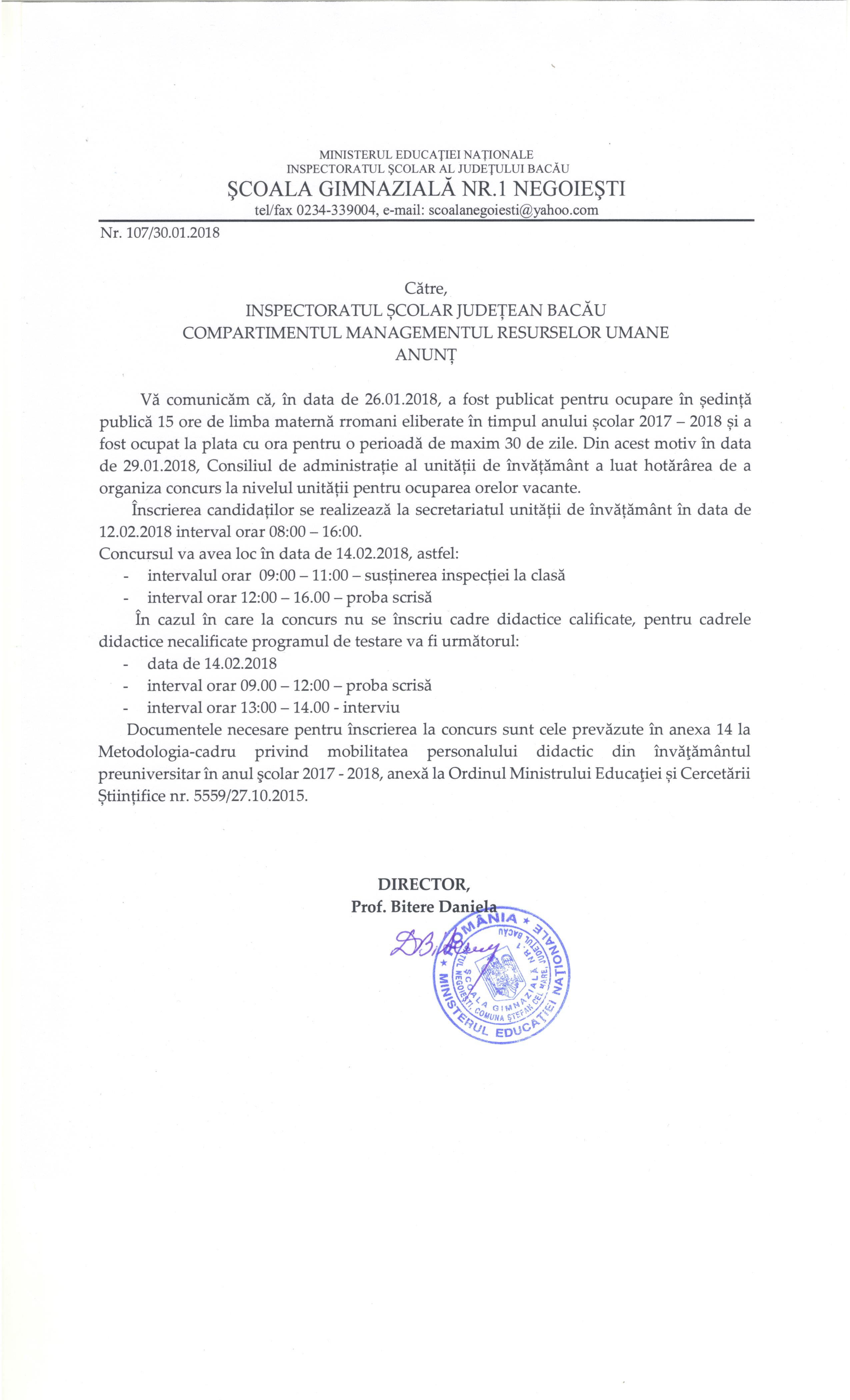 Anunt concurs - Scoala Gimnaziala nr. 1 Negoiesti