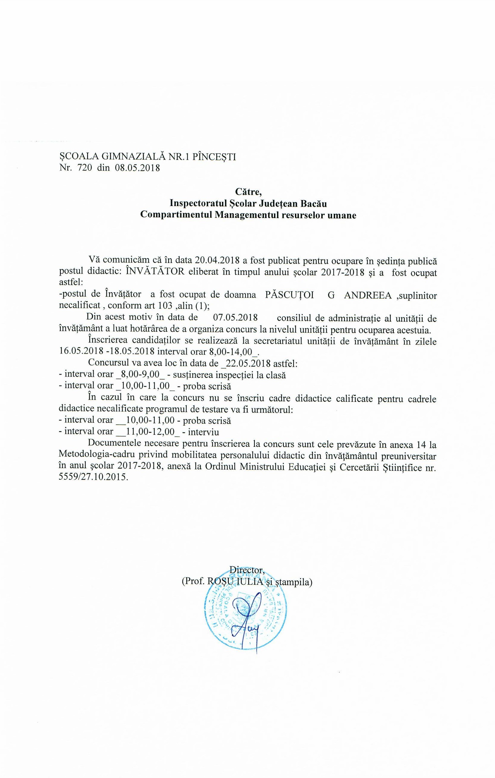 Anunt concurs - Scoala Gimnaziala nr. 1 Pincesti