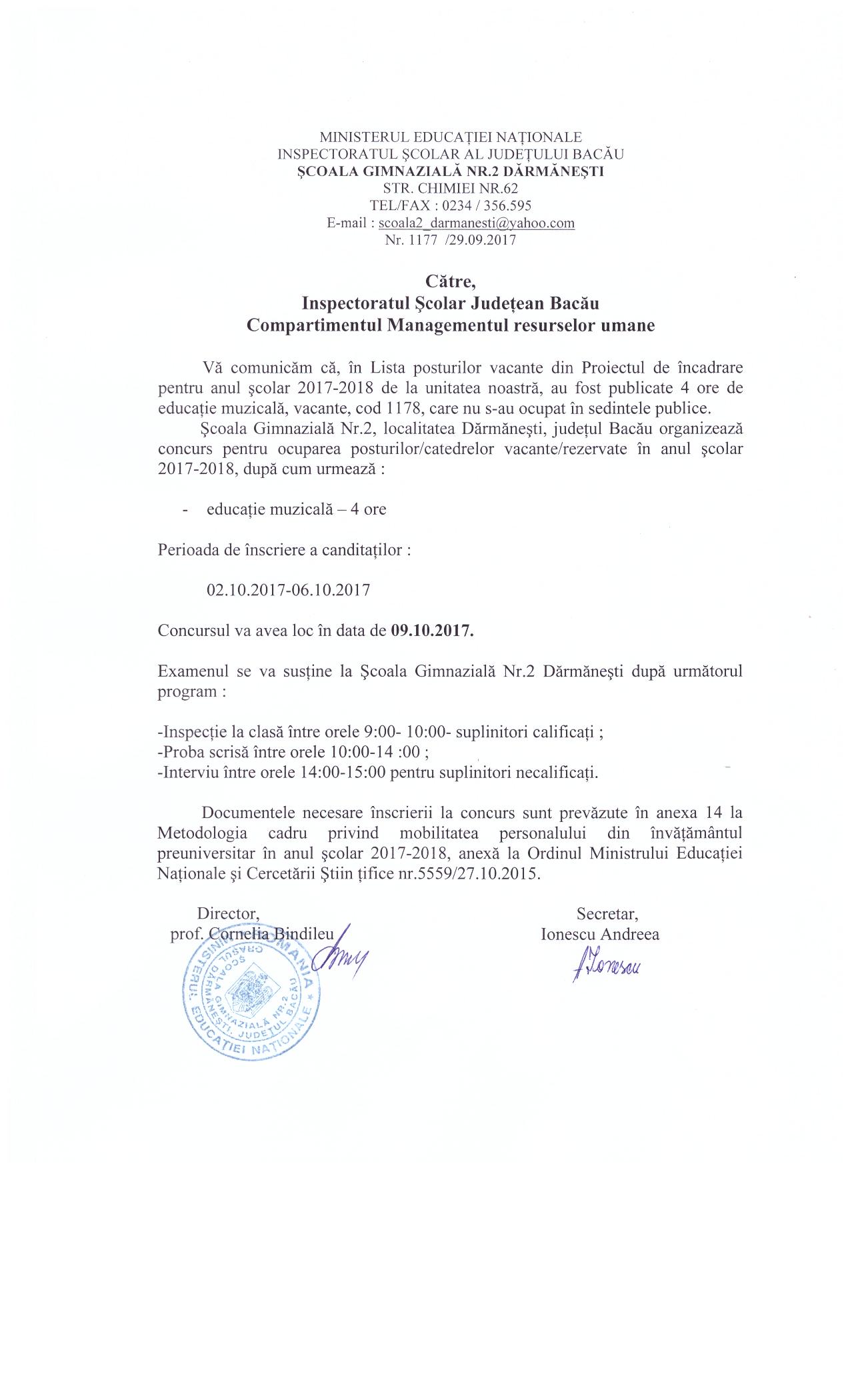 Anunt concurs - Scoala Gimnaziala nr. 2 Darmanesti