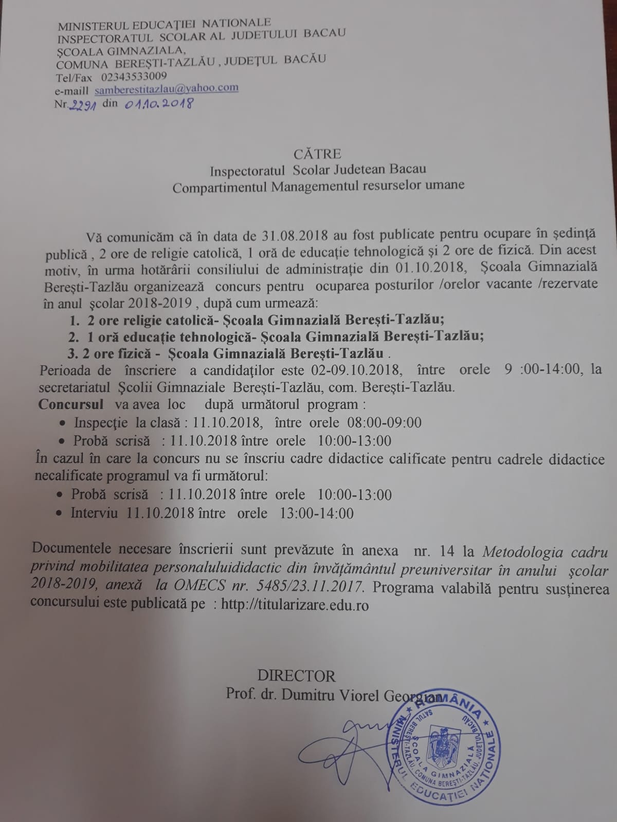 Anunt concurs Scoala Gimnaziala Beresti Tazlau