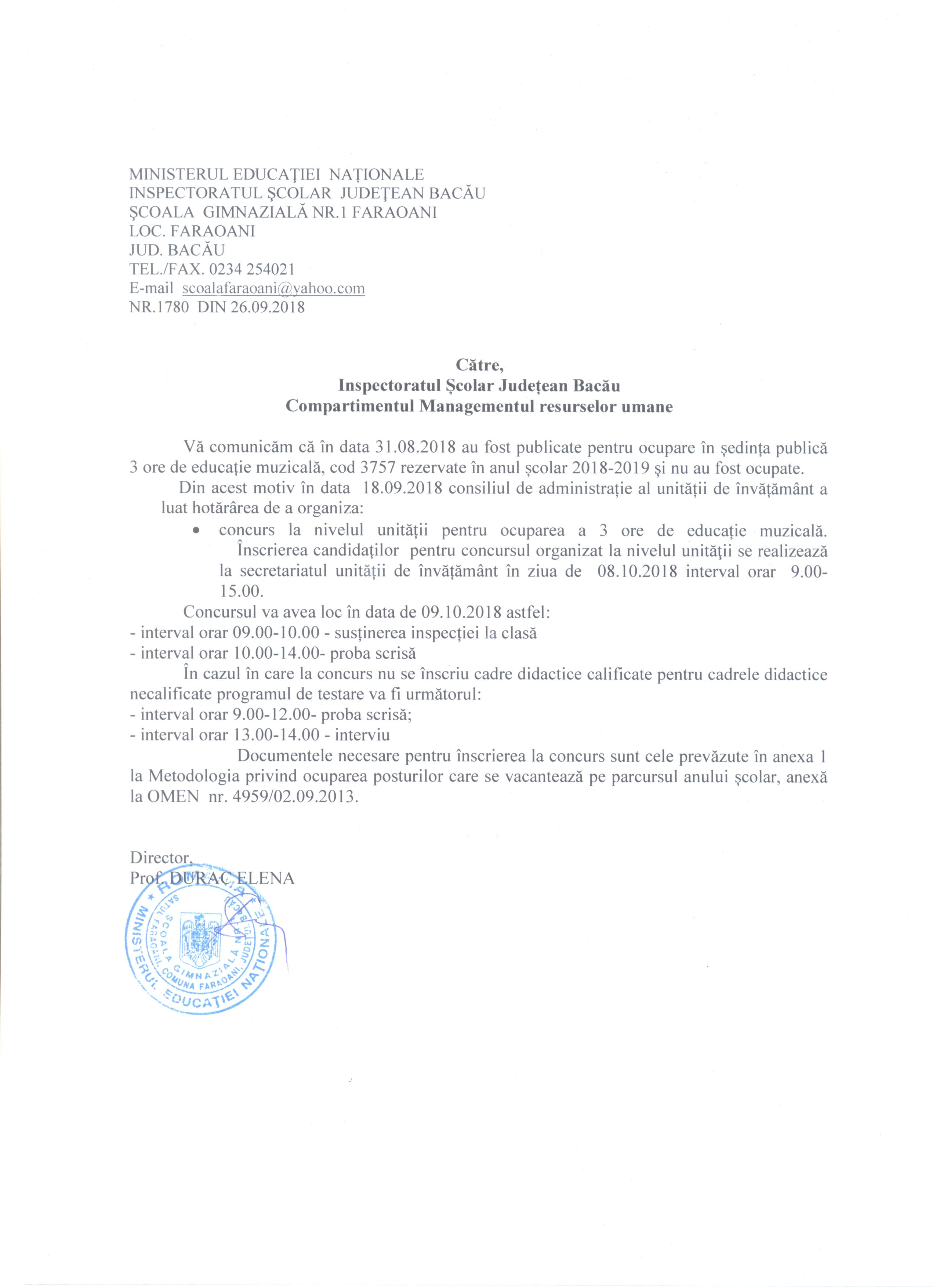 Anunt concusr Scoala Gimnaziala nr. 1 Faraoani