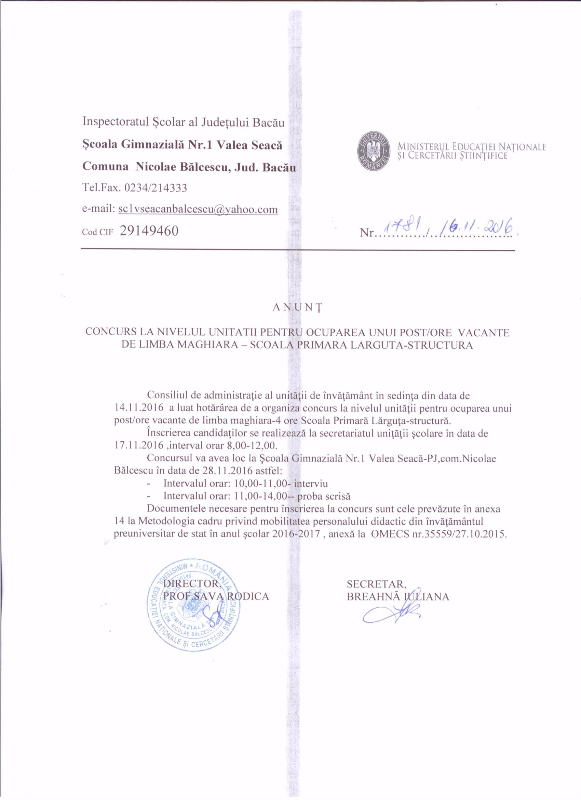 Anunt concurs - Scoala Gimnaziala nr. 1 Valea Seaca