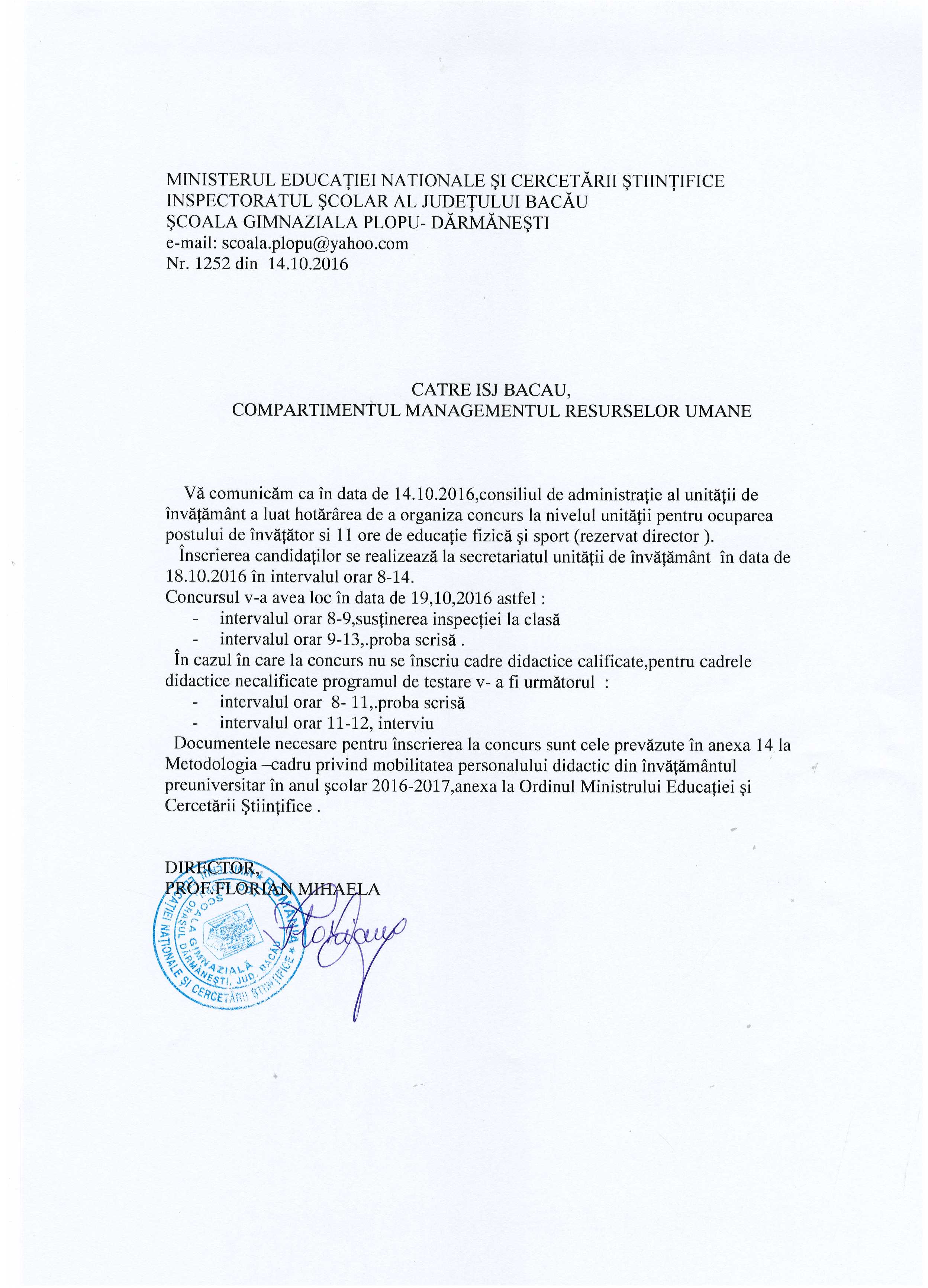 Anunt concurs - Scoala Gimnaziala Plopu