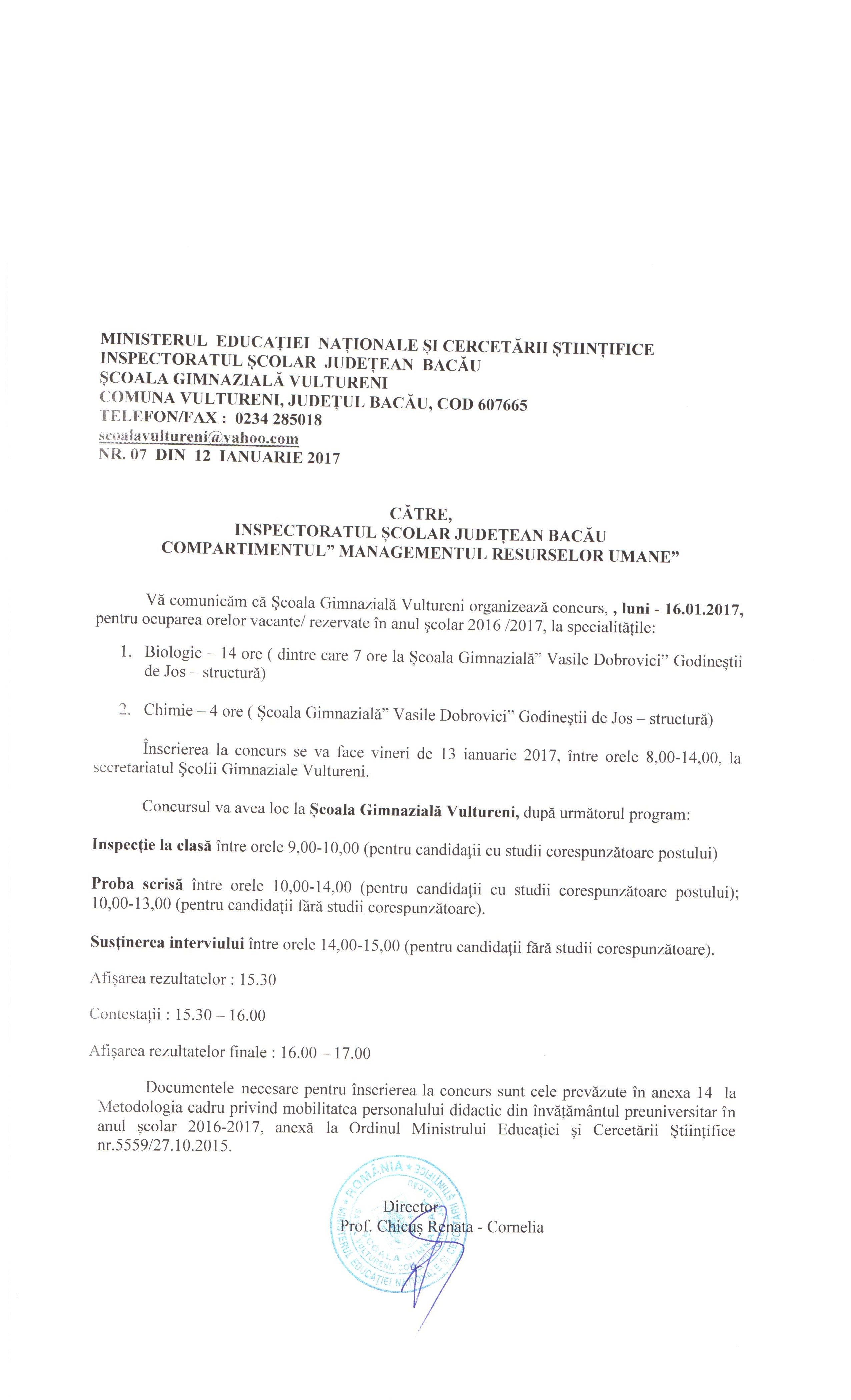 Anunt concurs - Scoala Gimnaziala Vultureni