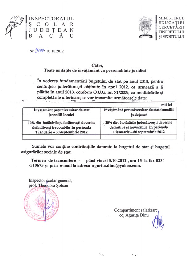 Catre toate unitatile de invatamant preuniversitar, cu personalitate juridica